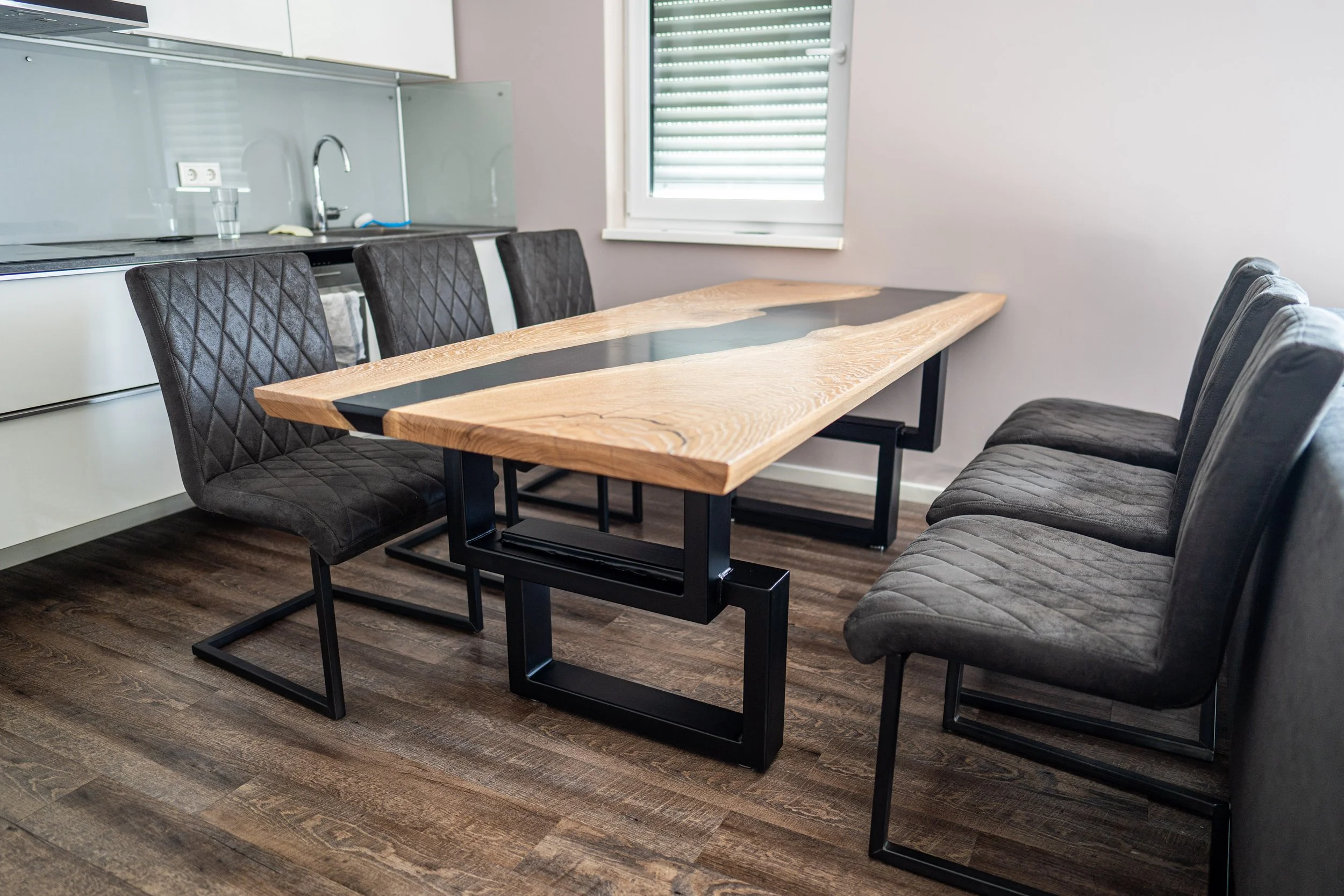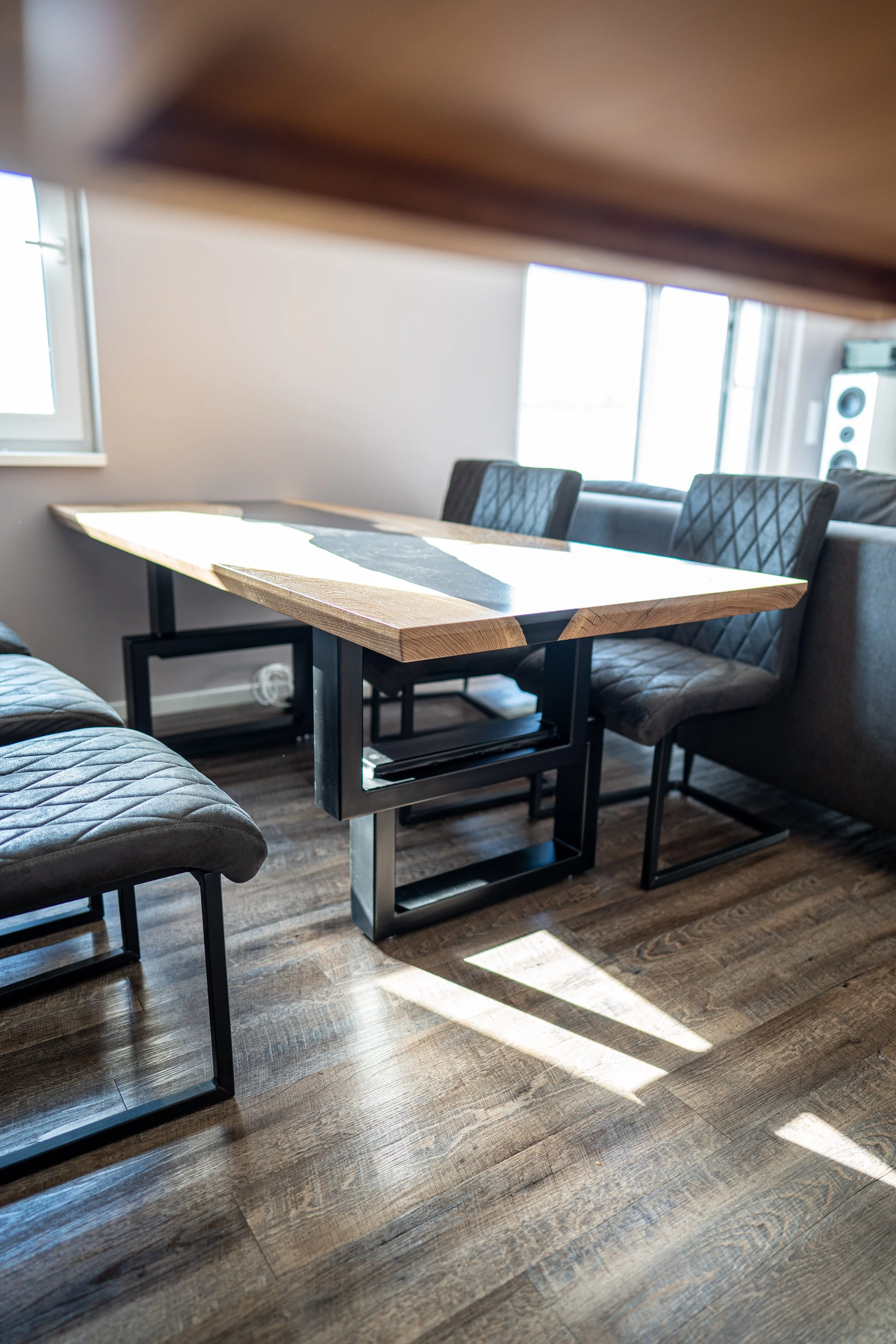 Um eine mühevoll gefertigte Tischplatte in der Luft zu halten, braucht es natürlich auch Beine, die dem gerecht werden. Bei einer nicht ganz rationalen Holzarbeit bietet sich bei den Beinen an, ebenso ein paar interessante Designansätze zu verfolgen. Das Ergebnis waren Rechteckrohre, die sich jeweils um die Hälfte überschneiden.
