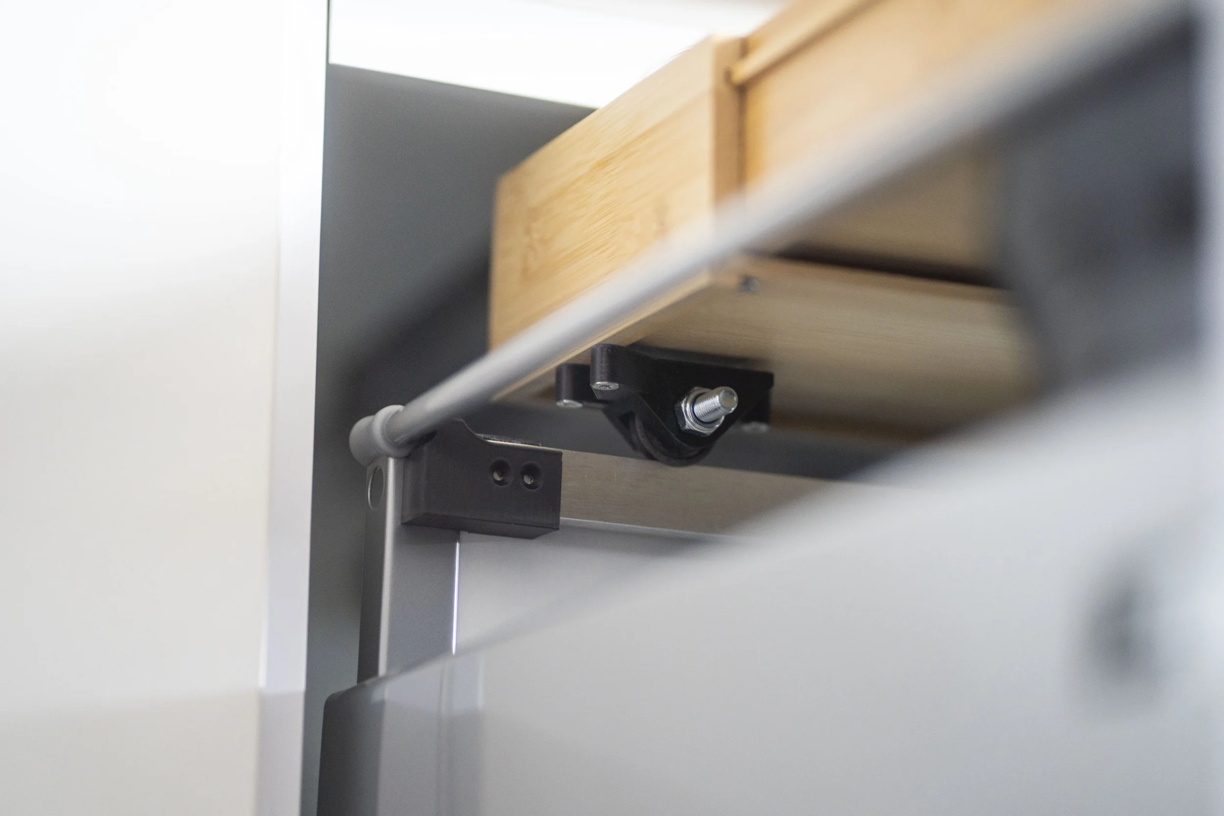In einer Küche ohne flachen Schubladen würde eine Besteckeinlage die volle Höhe einer Schublade belegen. Die Lösung war ein flaches Rollensystem, welches sich in die bestehenden Formen der Schublade integriert und ein müheloses hin- und herbewegen von dem Besteckeinsatz ermöglicht.