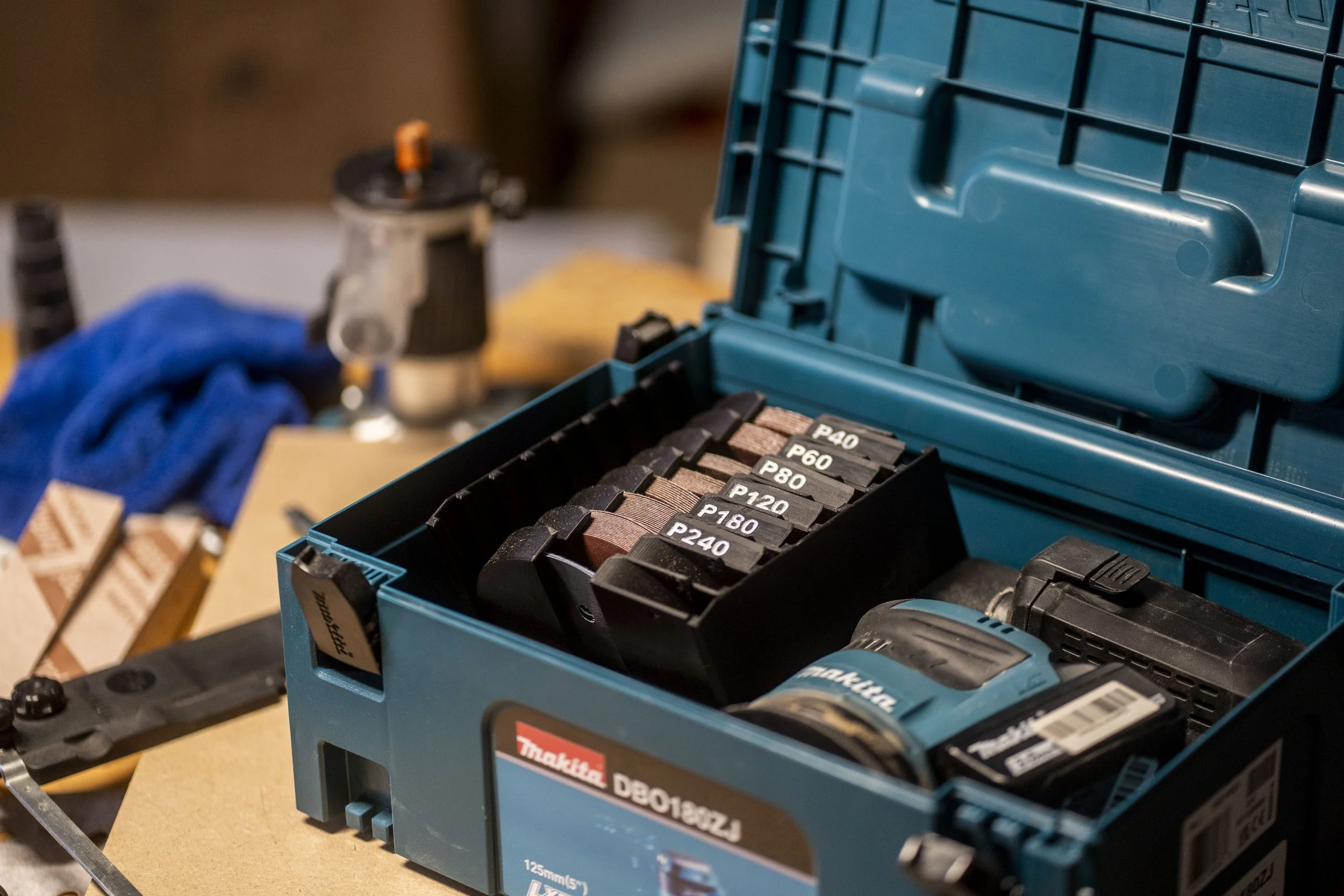 Unterwegs ist sehr wichtig, welches Zubehör man für ein Werkzeug mitnehmen muss und welches vielleicht optional ist. Genügend Schleifpapier steht bei mir da an oberster Stelle und um den begrenzten Platz im Transportkoffer optimal nutzen zu können, entwarf ich ein Sortiersystem perfekt für den verfügbaren Platz dimensioniert.